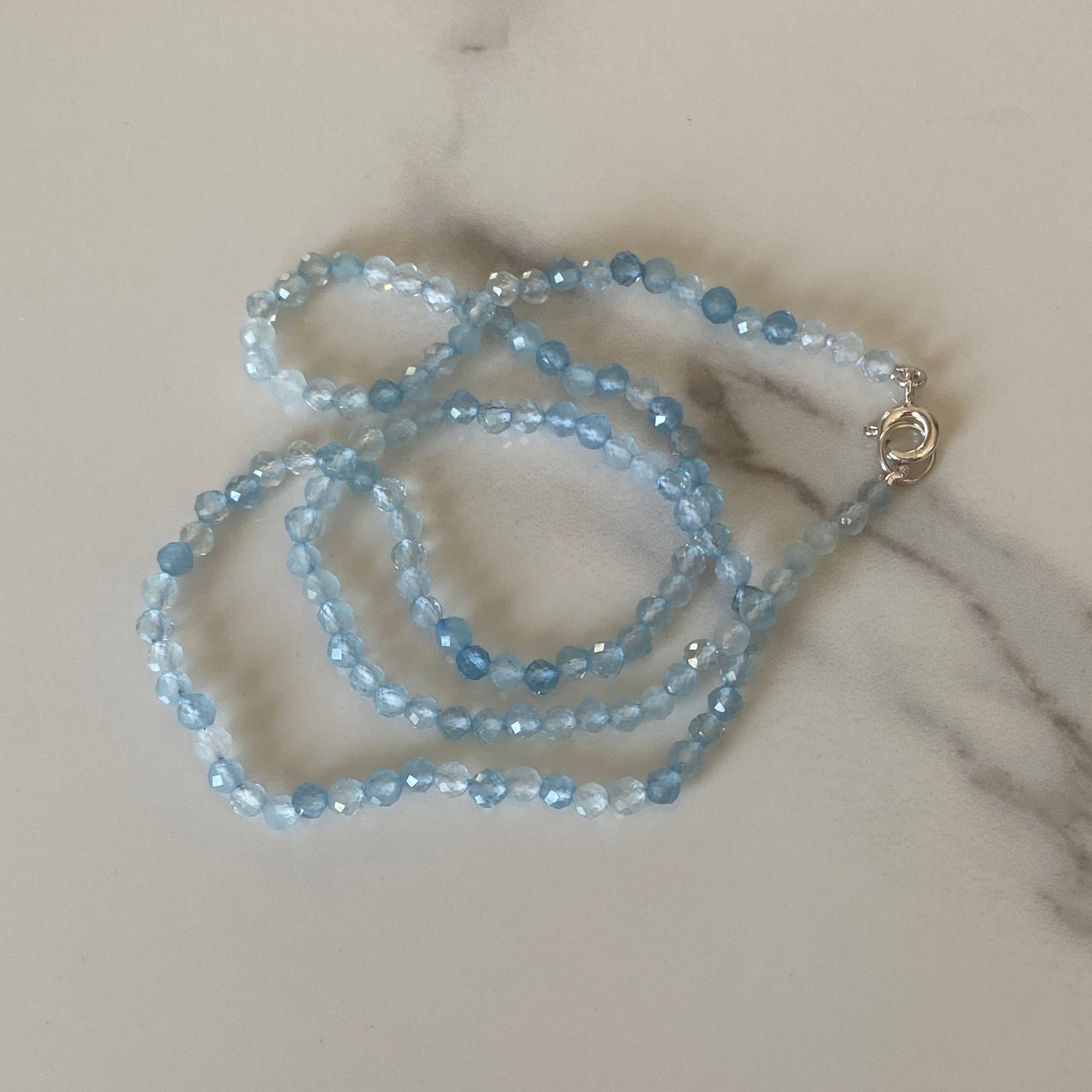 Indulge in the natural beauty of this Aquamarine sterling silver necklace. Guaranteed genuine 100% natural Aquamarine not treated in any way. These beads are nicely laser faceted to achieve the dazzling diamond look! Pictures don't do justice to these amazing sparkling gems! Made for Aquamarine lovers with discerning eyes who recognise top tier! This necklace is the perfect statement piece for any occasion. Elevate your style with the soothing and mesmerising energy of Aquamarine.